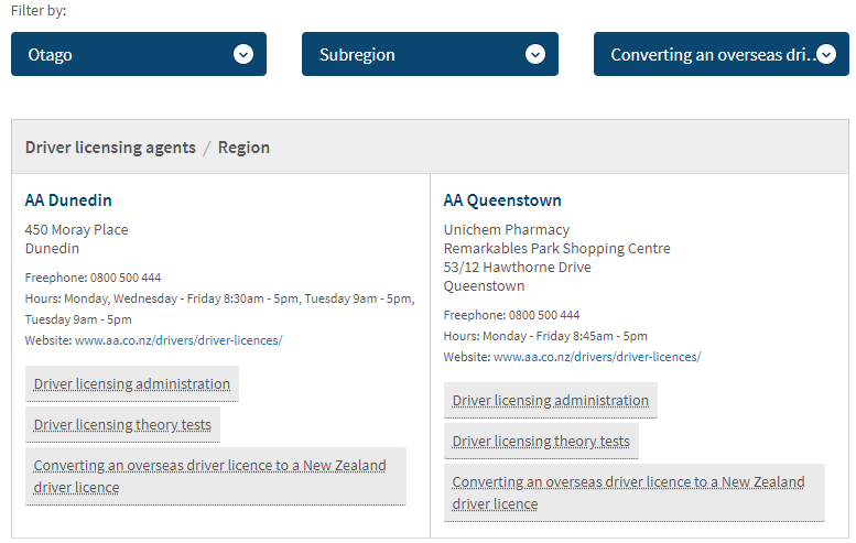 在大城市如奧克蘭、威靈頓、基督城容易找到換發單位,如果在偏遠鄉村就要跑很遠啦,例如南島整個Otago區域 只有兩個地方可以換發AA Queenstown跟AA Dunedin。