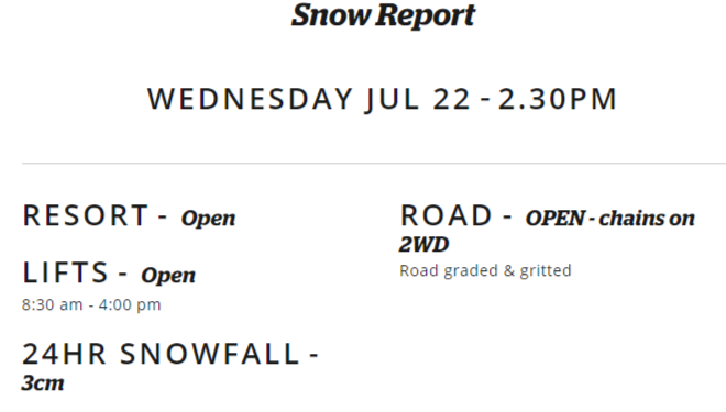 - 雪場報告會說明上雪場的道路狀況,例如全面通行、兩輪車需上雪鍊 (2WD with chain)、全部車上雪鍊 (all car fit chain)