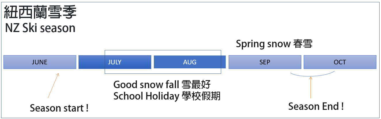 紐西蘭的雪季大約從六月中開始至十月底左右 。