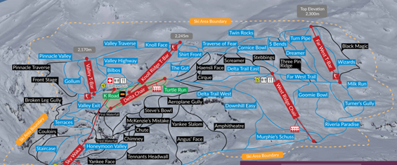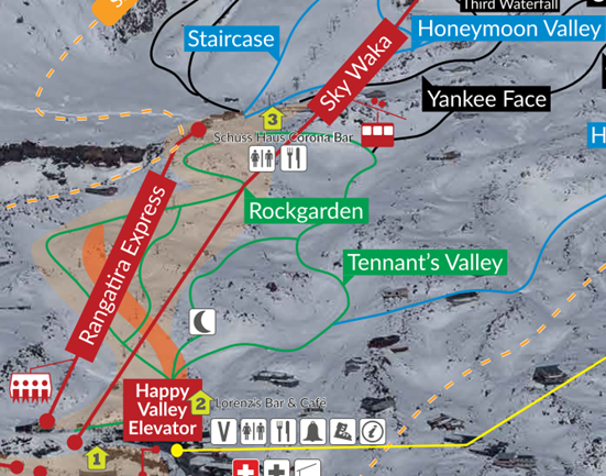 - 進階雪道地圖 Lower mountain (Rangatira 跟 天空纜車 sky waka) – 中高級滑雪道