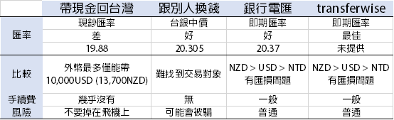 銀行電匯及wise,雖然匯率佳,不過要換兩次 (NZD > USD > NTD) 會有匯損,外加手續費用,如果持有紐幣較多再選擇用這種方式匯錢。此兩種方法相比推薦使用wise,匯率最好!